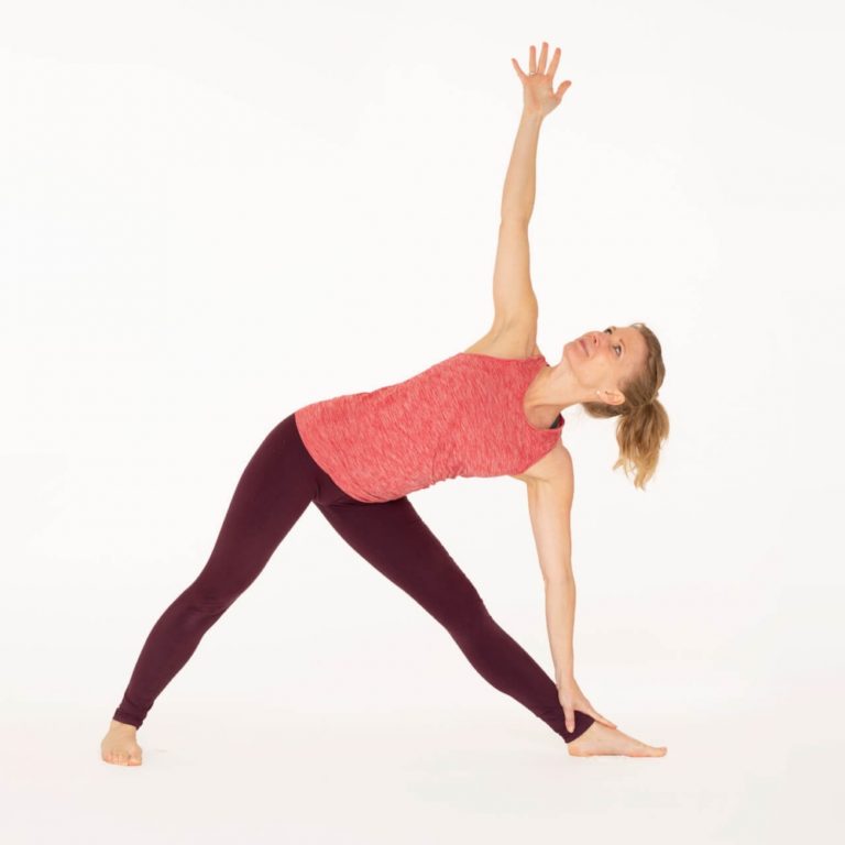 Female Wearing Black Leggings and a Blue Top in Warrior -1-Pose